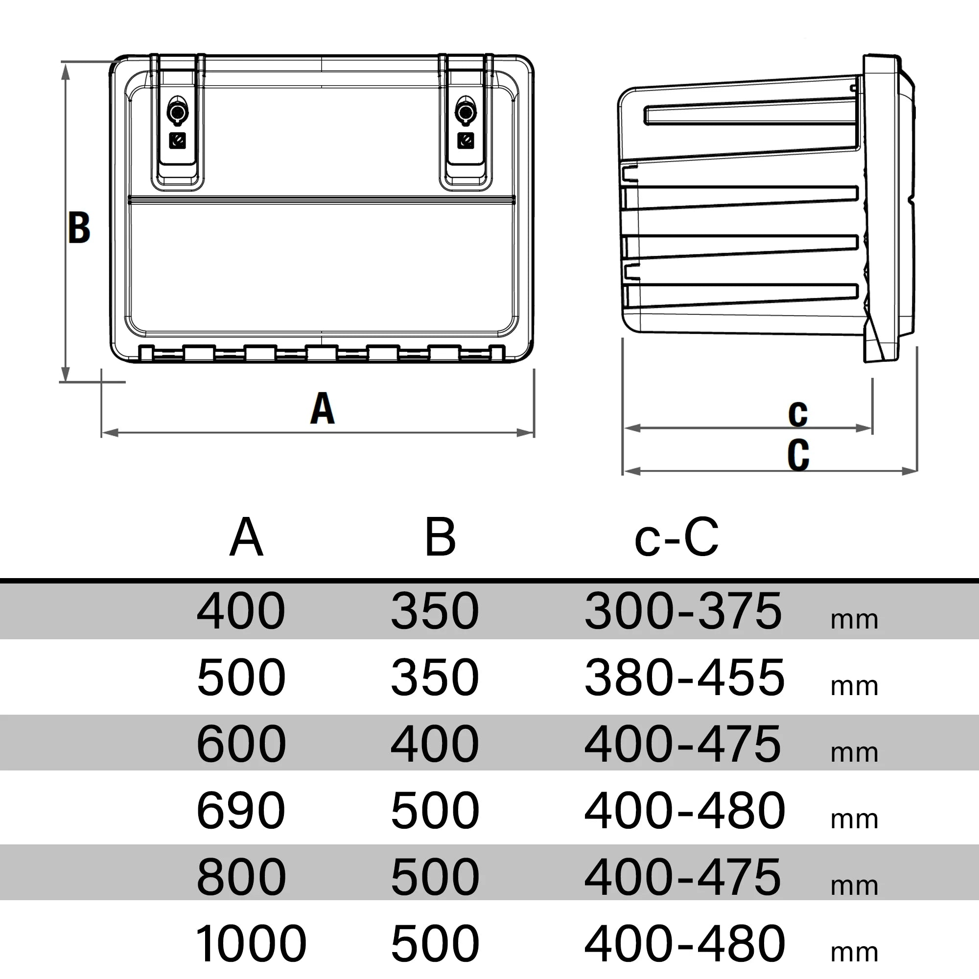 - Plusieurs dimensions disponibles : S’adapte à tous les besoins de stockage grâce à un large choix de tailles, de 400 x 350 x 300 mm à 1000 x 500 x 400 mm.